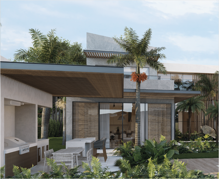 En cuanto al diseño, los techos inclinados y las pérgolas añaden dinamismo, creando un espacio que respira belleza y serenidad