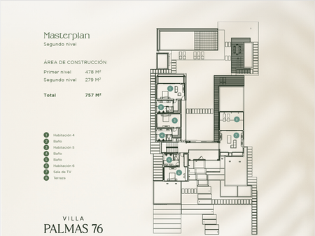 2 niveles con un área total de construcción de 757 m² (478 m² en el primer nivel y 279 m² en el segundo nivel).