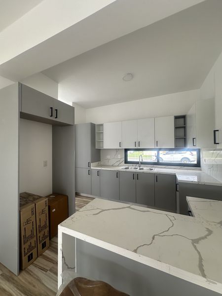Cocina modular con un amplio y cómodo espacio para desayunar.